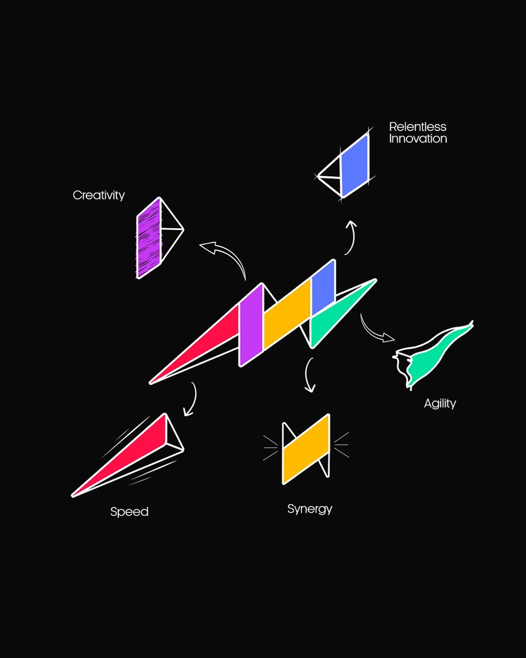 Rebranding a creative marketing agency like ours was a real challenge—we had to make sure every detail was flawless. We dug deep into what defines us and refined our identity around five core values: Synergy, Creativity, Agility, Relentless Innovation, and Speed.